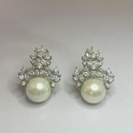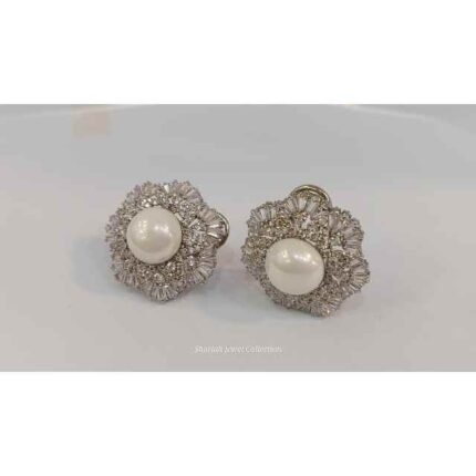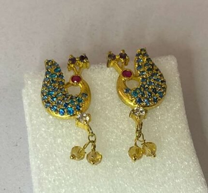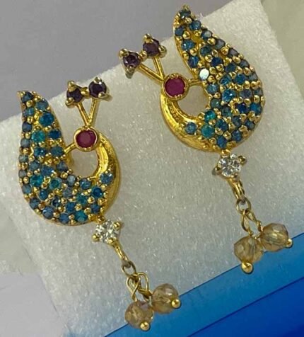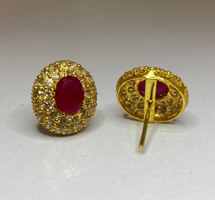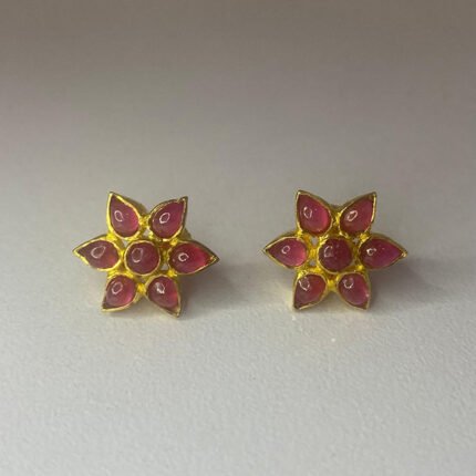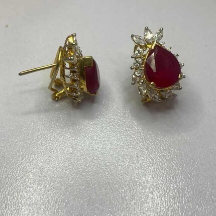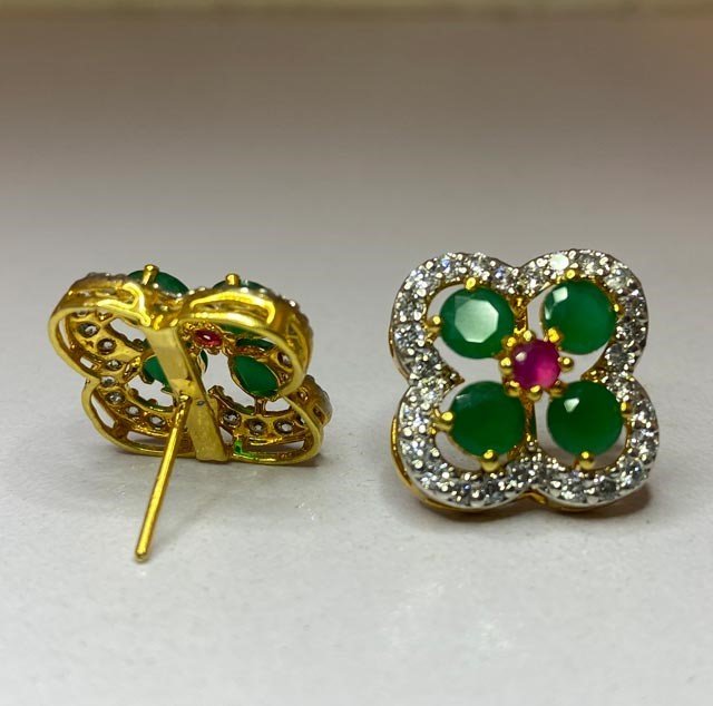 The earrings in the image feature a flower-like design with Emerald and Ruby stones surrounded by smaller White Zircons, all set in a gold-toned metal.