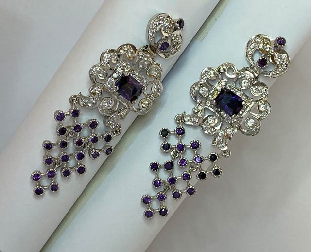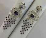 At the heart of the design, brilliant-cut white zircons glimmer with understated luxury, gracefully complementing the rich hues of faceted amethyst stones. The amethysts are arranged in a delicate, dangling structure, creating fluid movement and catching the light with every step.
