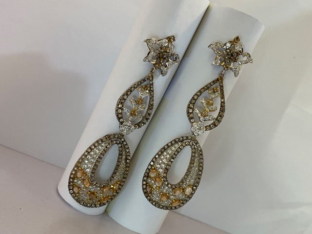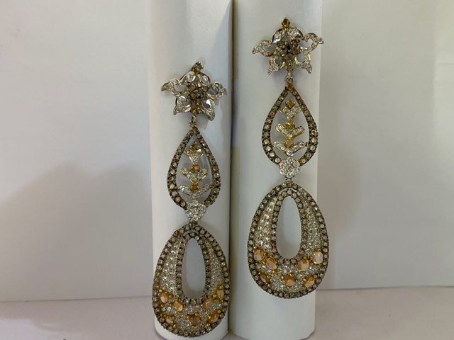 Adorned with honey-colored zircons, white zircons, and coffee-hued zircons, each stone is carefully set to create a rich tapestry of warm, sparkling tones. The unique color combination lends a sophisticated contrast, making these earrings perfect for both day and evening wear.