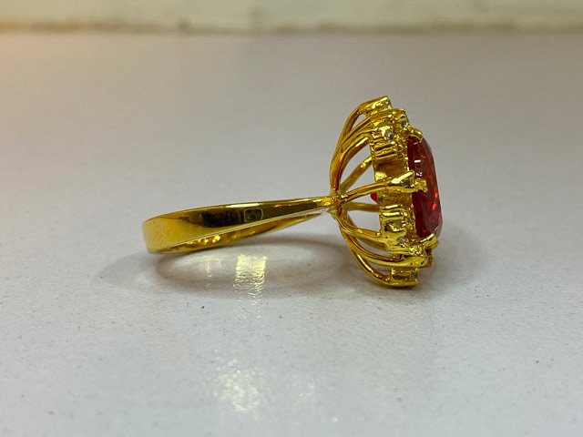 The ring features a timeless and elegant design, making it a perfect choice for an engagement ring. At its center, a vibrant orange zircon catches the eye, beautifully accented by a halo of small white zircons. The ring, crafted from 925 sterling silver and finished with a rich gold polish, adds a touch of warmth and sophistication, while the additional white zircons along the ring enhance its brilliance and charm.