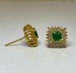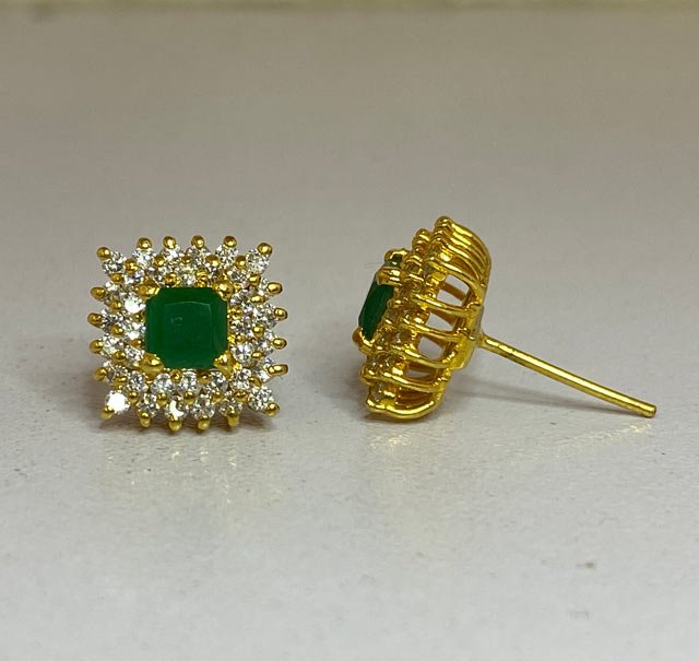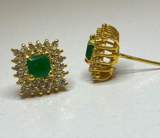 These tops feature a central square-cut emerald surrounded by small white zircons set in a gold-toned metal. The design is detailed, with the side view showing the depth and structure of the setting. The earrings appear to be designed for everyday use.